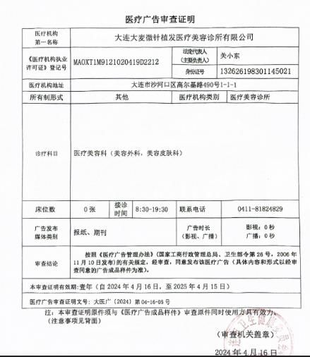 大连大麦微针植发医疗美容诊所,位于大连市沙河口区高尔基路490号1-1-1,隶属大麦微针连锁(原科...