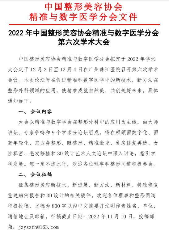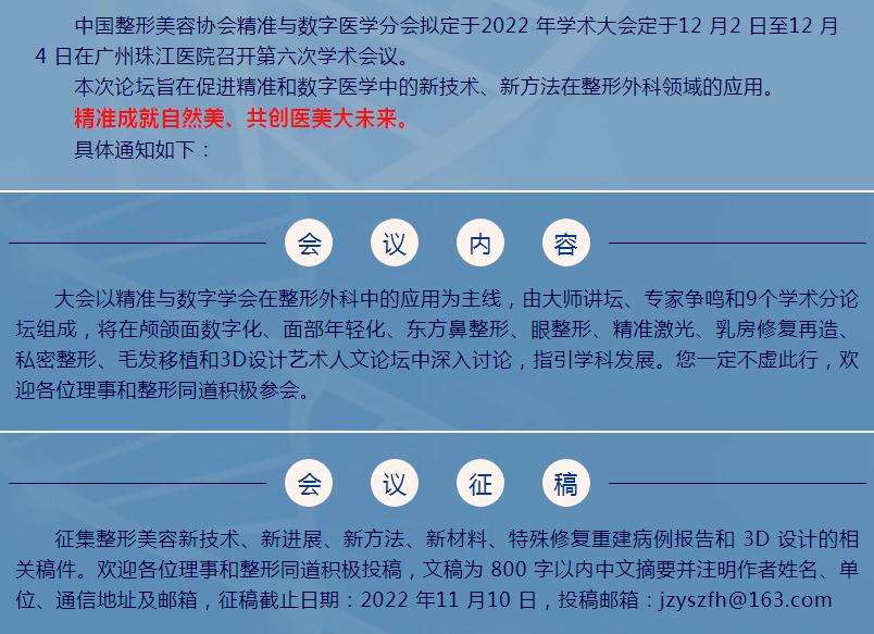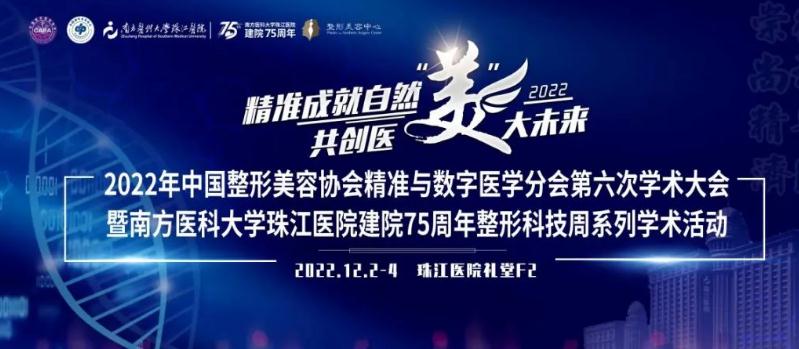 中国整形美容协会精准与数字医学分会拟定于2022 年学术大会定于12月2日至12月4日在广州珠江医院召开第六次学术会议,本次论坛旨在促进精准和数字医学中的新技术、新方法在整形外科领域的应用,精准成就自然美、共创医美大未来。