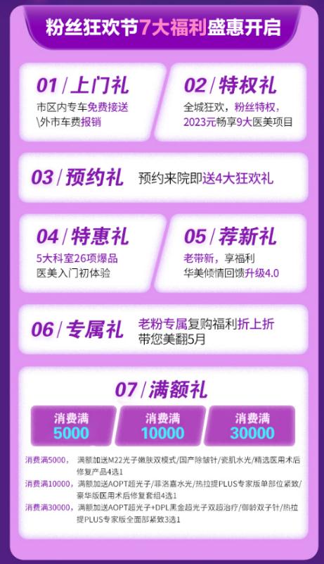 海南华美第5届粉丝狂欢节,与你狂欢,耀你好看,7大福利,开启盛惠,预约来院即送4大狂欢礼,老带新,享福利,消费满送大礼,带你美翻5月,抓紧时间来体验吧。