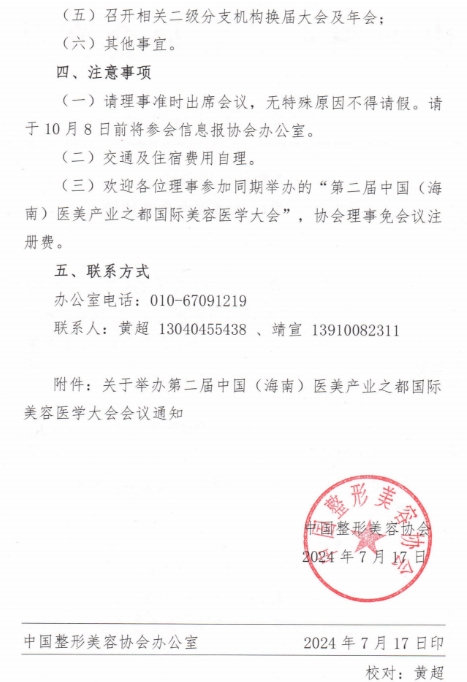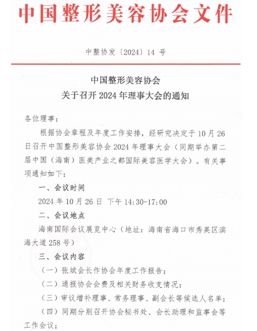 根据协会章程及年度工作安排,经研究决定于10月26日召开中国整形美容协会2024年理事大会。有关事项通知如下: