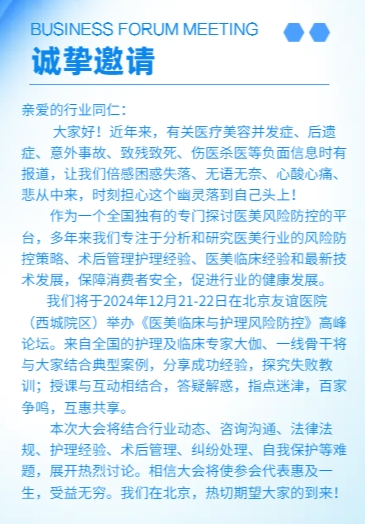 回归医疗本质,共筑健康未来,中华文化促进会-医疗美容文化专业委员会,向大家发出邀请,邀请大家参与医美临川与护理风险防控高峰论坛。