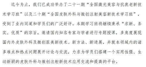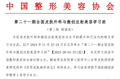 为促进皮肤外科和微创注射美容技术水平的提升和行业内的相互学习与交流,拟于2024年11月22-24日在北京举办“第二十一期全国皮肤外科与微创注射美容学习班”。