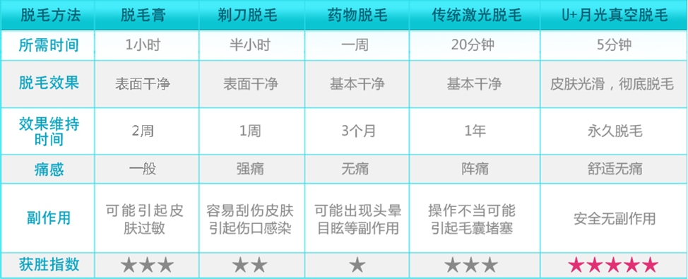 U+月光真空脱毛是激光脱毛技术最新、最强大的升级版,该技术使用独特的激光治疗技术,充分利用光和热的综合效应,穿透皮肤到达不同的组织深度,阻碍和终止毛发生长,达到永久性脱毛效果,脉冲光穿透皮肤和组织,完全不损伤周围正常组织,能够安全、高效、快捷去除身体上任何部位,不同粗细程度的毛发,同时对毛囊附近的汗腺没有任何影响,不会破坏人体的正常生理功能。